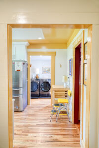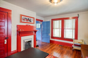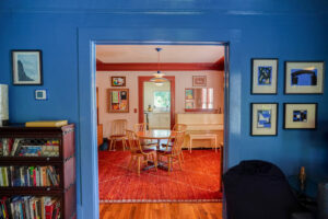 Inside, the front room doubles as a cozy home office with a couch and workspace—ideal for remote work or creative projects. The main living room is wrapped in soothing shades of blue, offering a calming space to relax or recharge. Just beyond, the dining area is anchored by a statement piano and built-in desk nook, perfect for music, meals, or multitasking.
