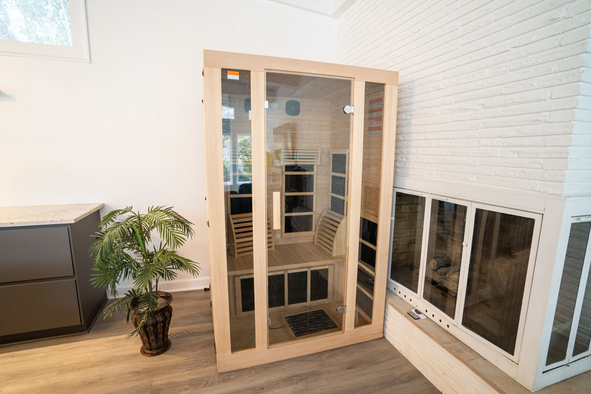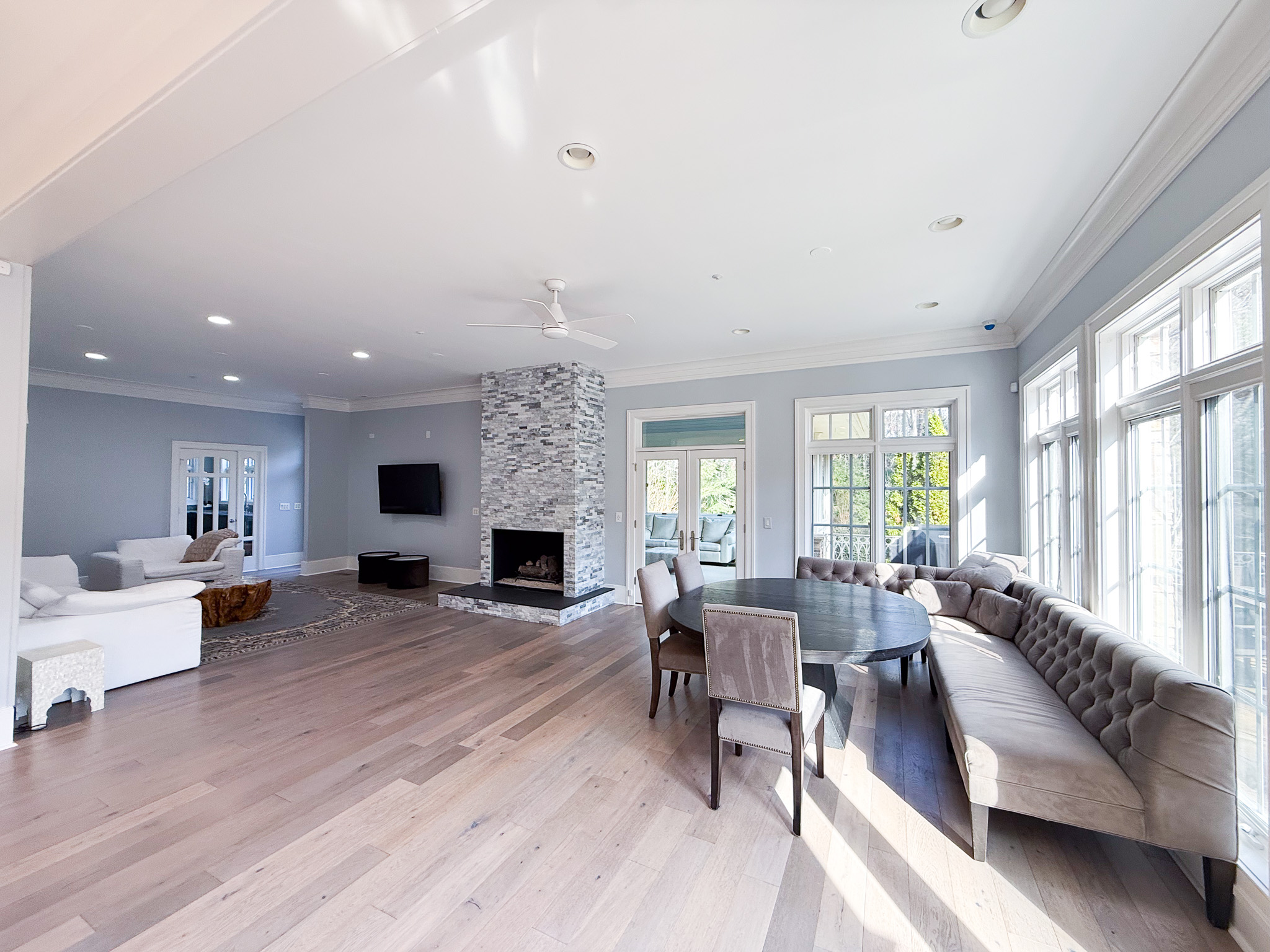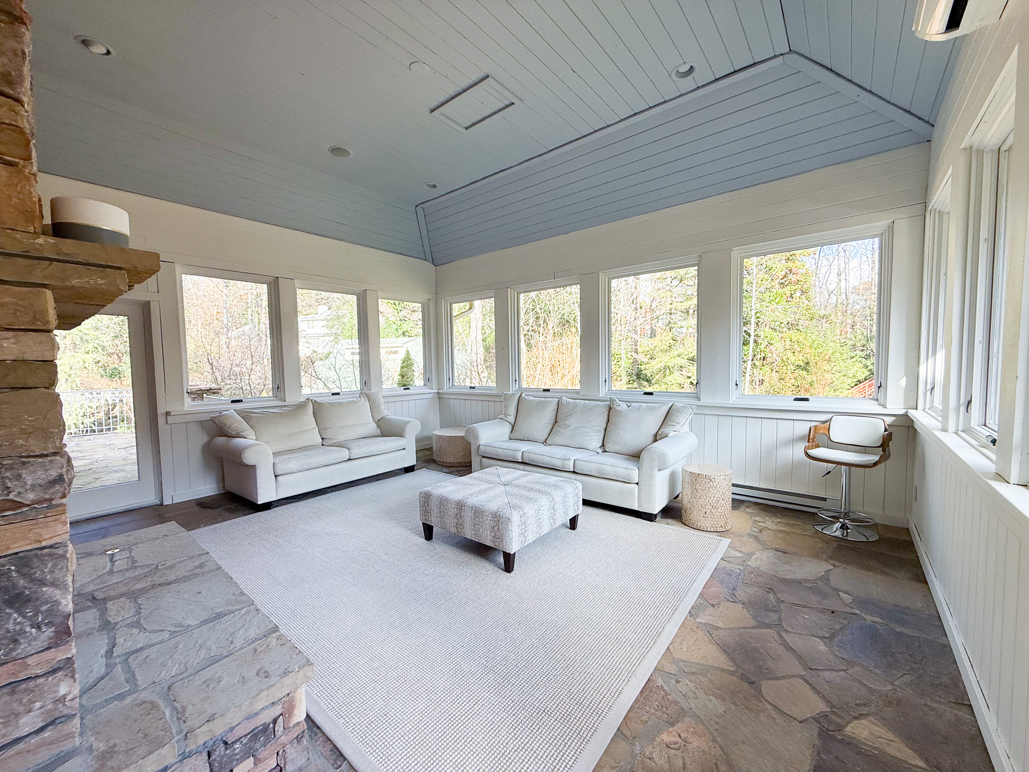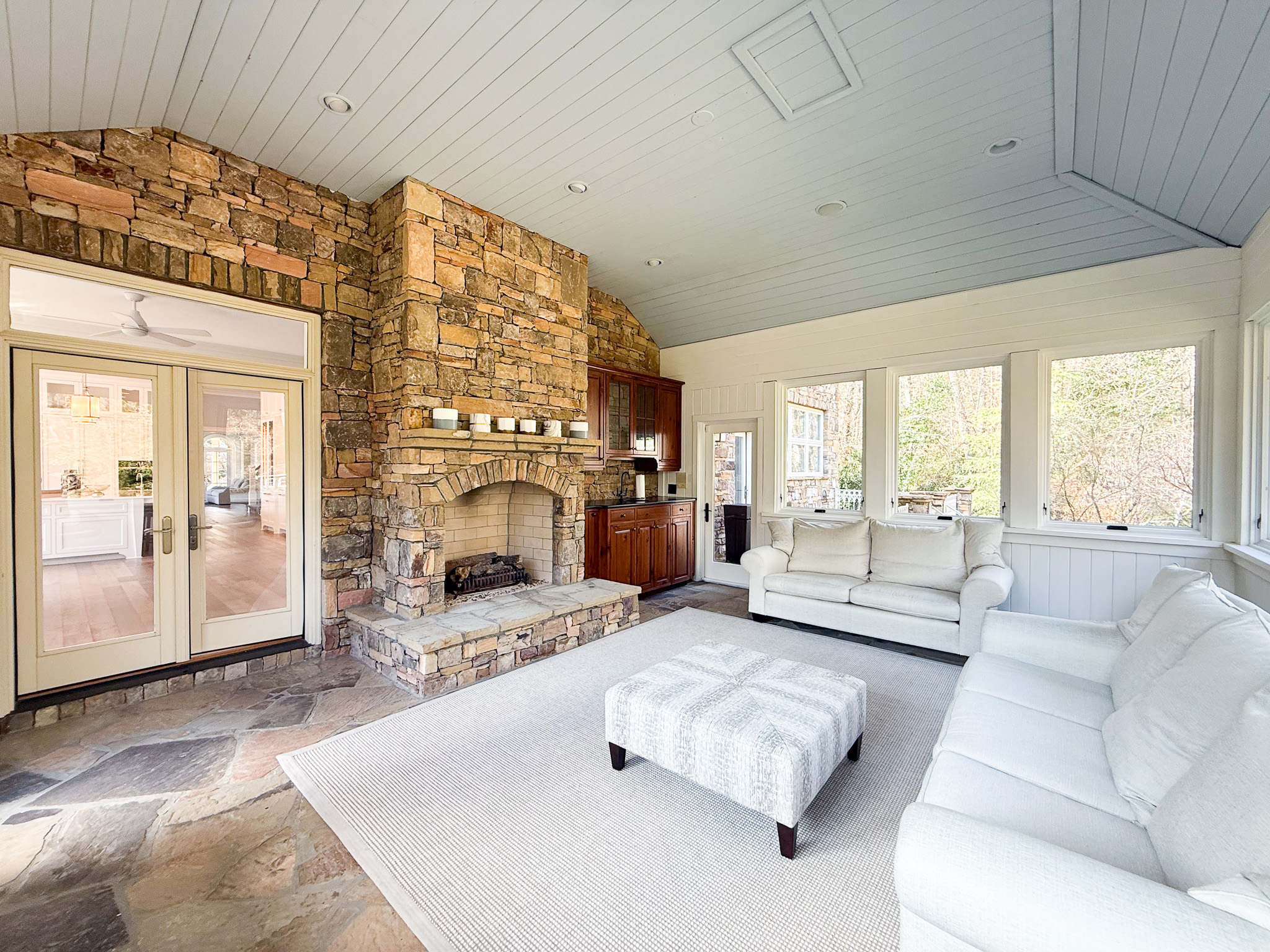 Sun Room: A serene retreat with dedicated seating and a cozy fireplace, perfect for year-round relaxation.