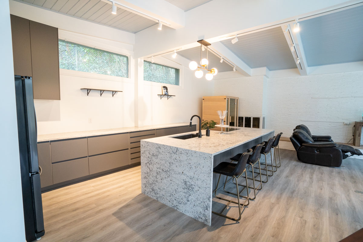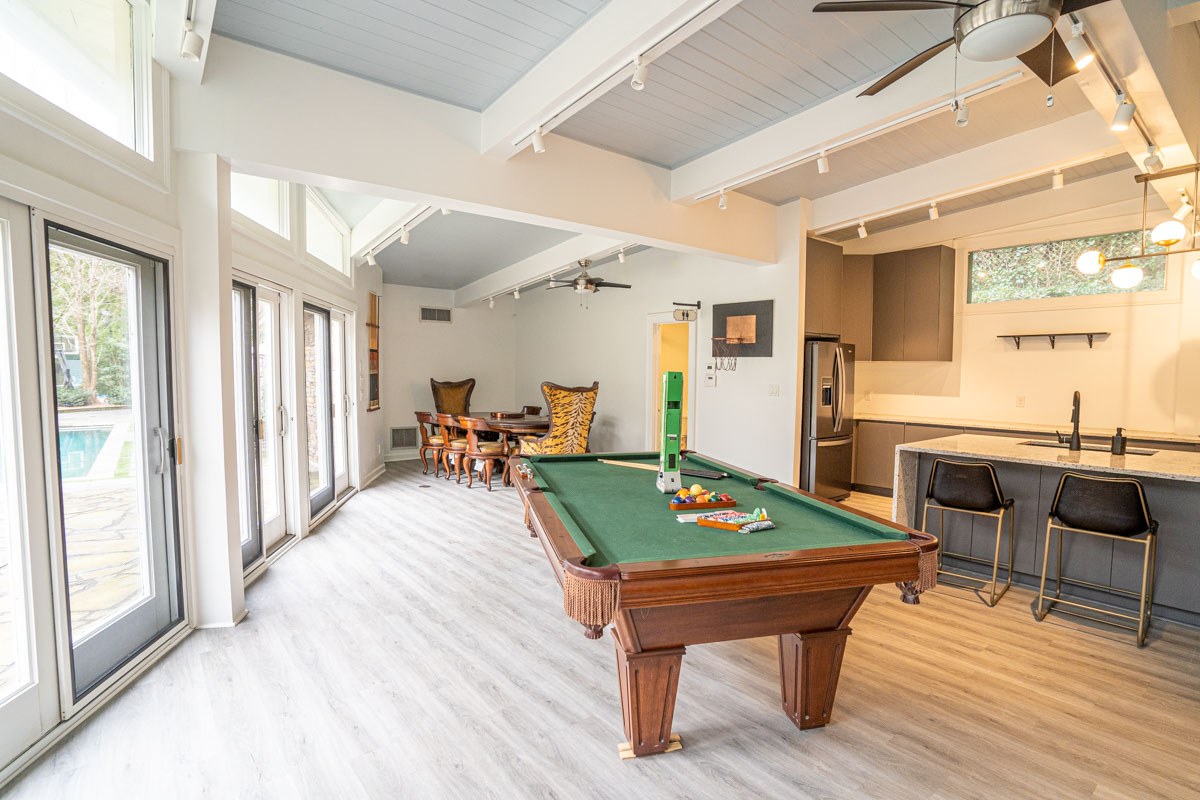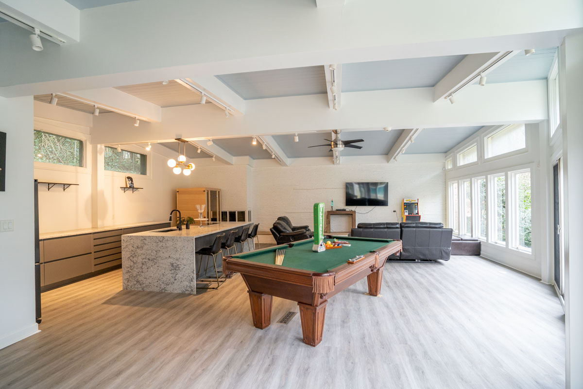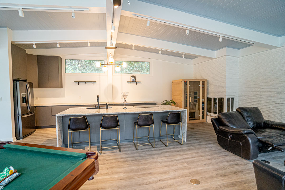The Pool House: Features a private sauna, full kitchen, and a lounge area with a pool table.