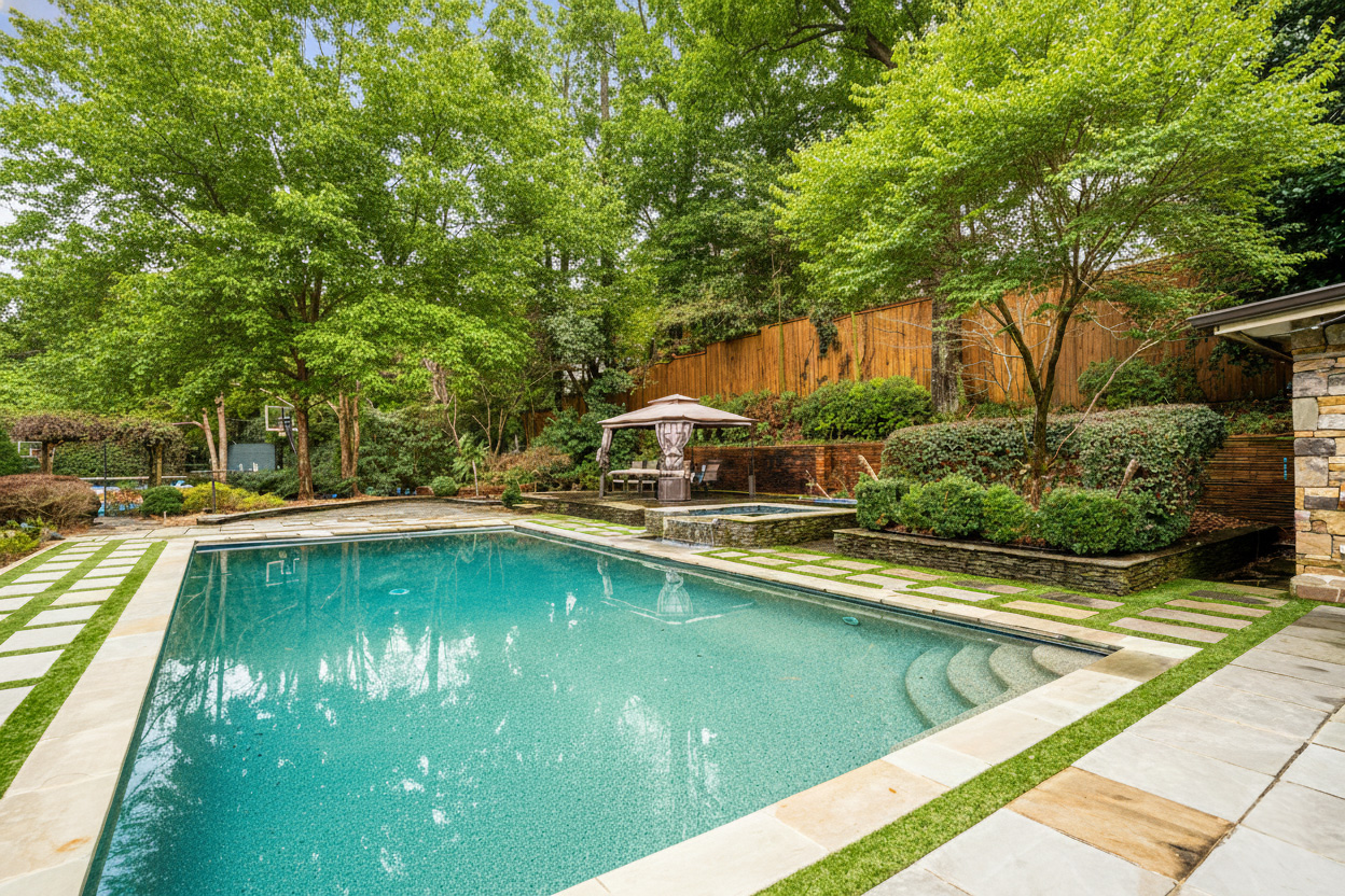 The Pool Oasis: A heated saltwater pool and hot tub surrounded by professional landscaping.