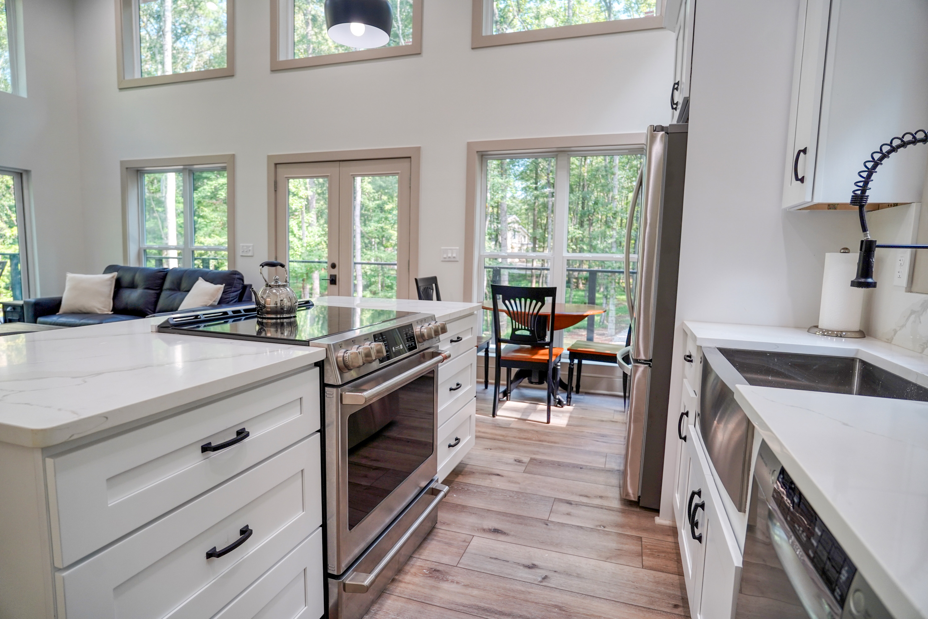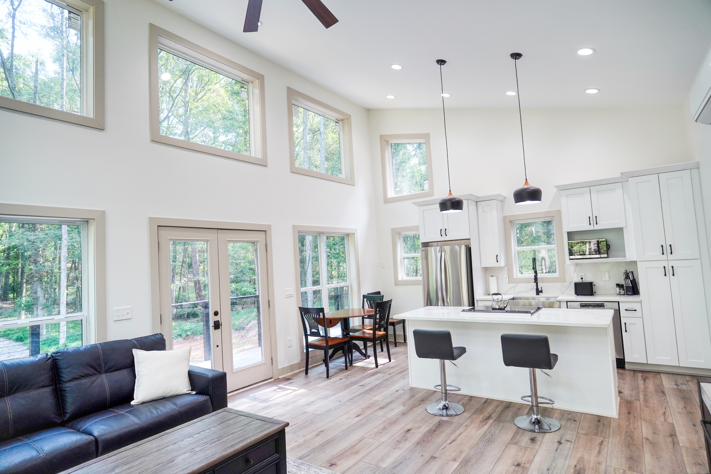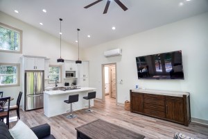Step into a light-filled open floor plan with high ceilings and a seamless flow between the kitchen, dining, and living spaces. Two sets of glass doors open to a wraparound deck with ample seating.The luxurious bathroom features a double vanity, a walk-in shower with a rainfall head and side body sprayers for a spa-like experience, and a stackable laundry closet conveniently located in the hall. The serene bedroom includes a mounted TV and direct deck access, creating a private sanctuary.
